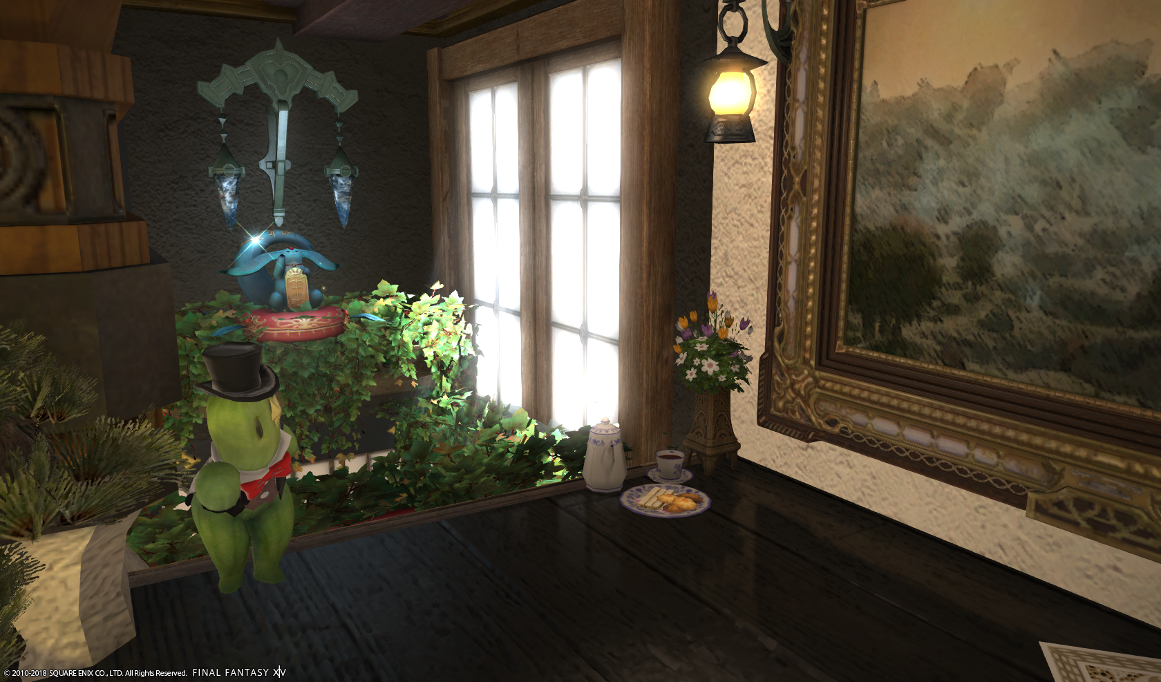 From there carefully make your way to the front where you can jump and wedge yourself between the wood arch and the fluffy flowery white moogle at the front of the mansion and make your way to the very top.